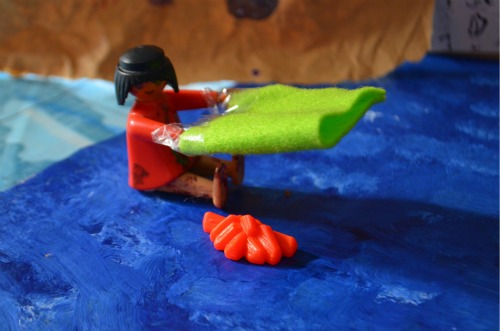 She also wrote an essay on communication between tribes but I didn’t get a photo of it before it was cut up and stuck on the board (more on that later) as well as using a Play Mobil figure and felt to demonstrate how smoke signals are made:
